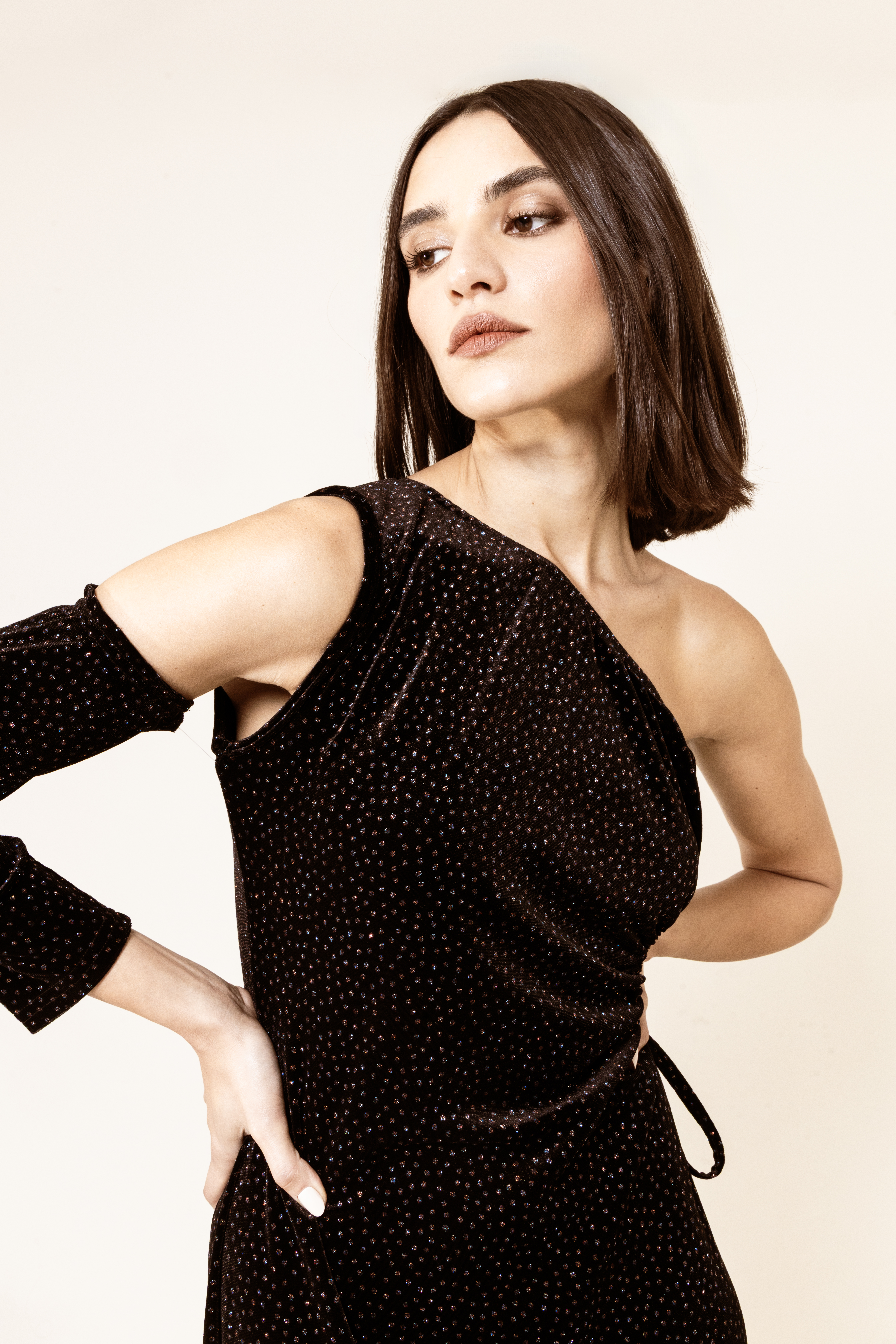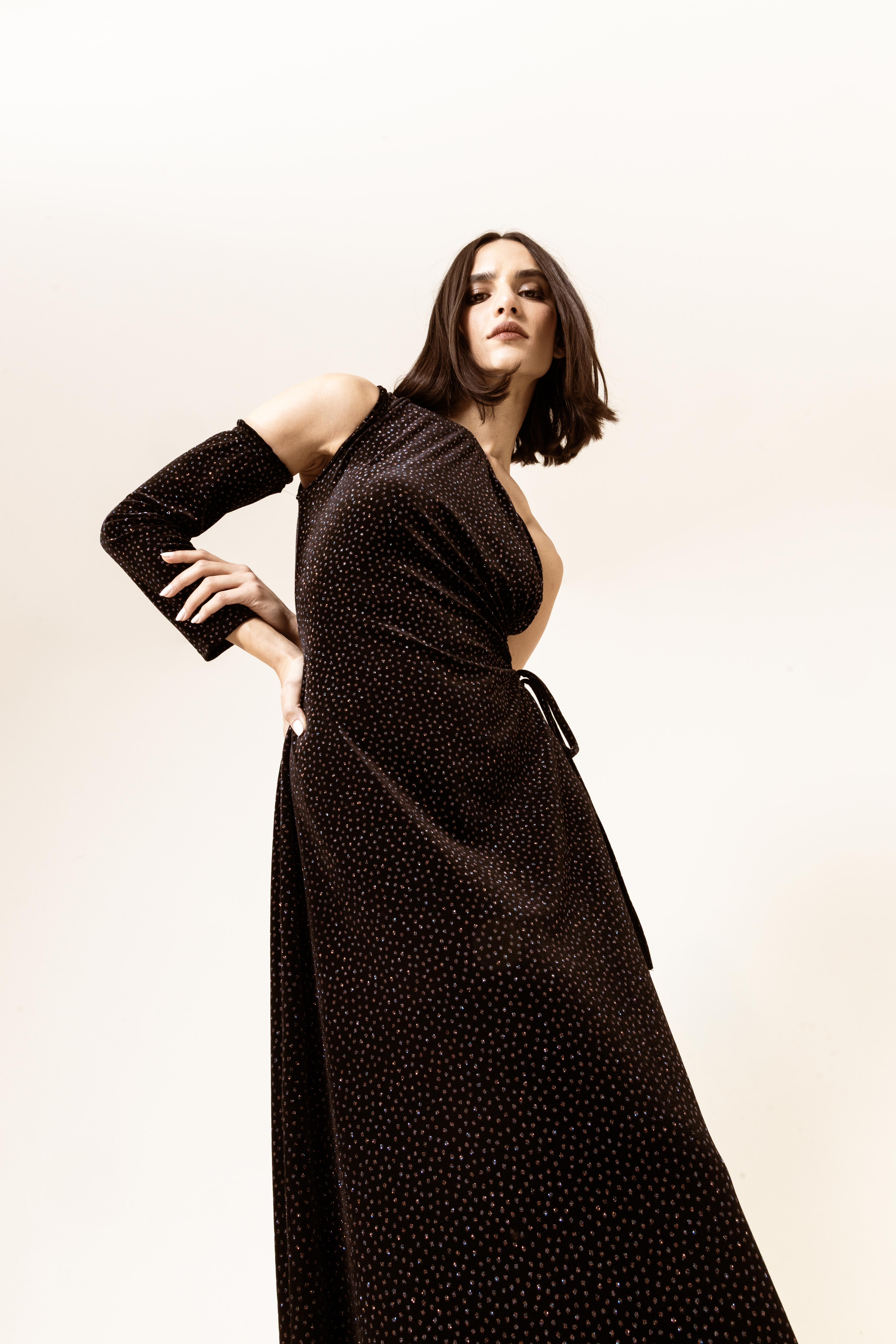A stunning velvet long dress with an open waist detail, designed to flatter your silhouette while adding a touch of drama. Perfect for evening events and special occasions.