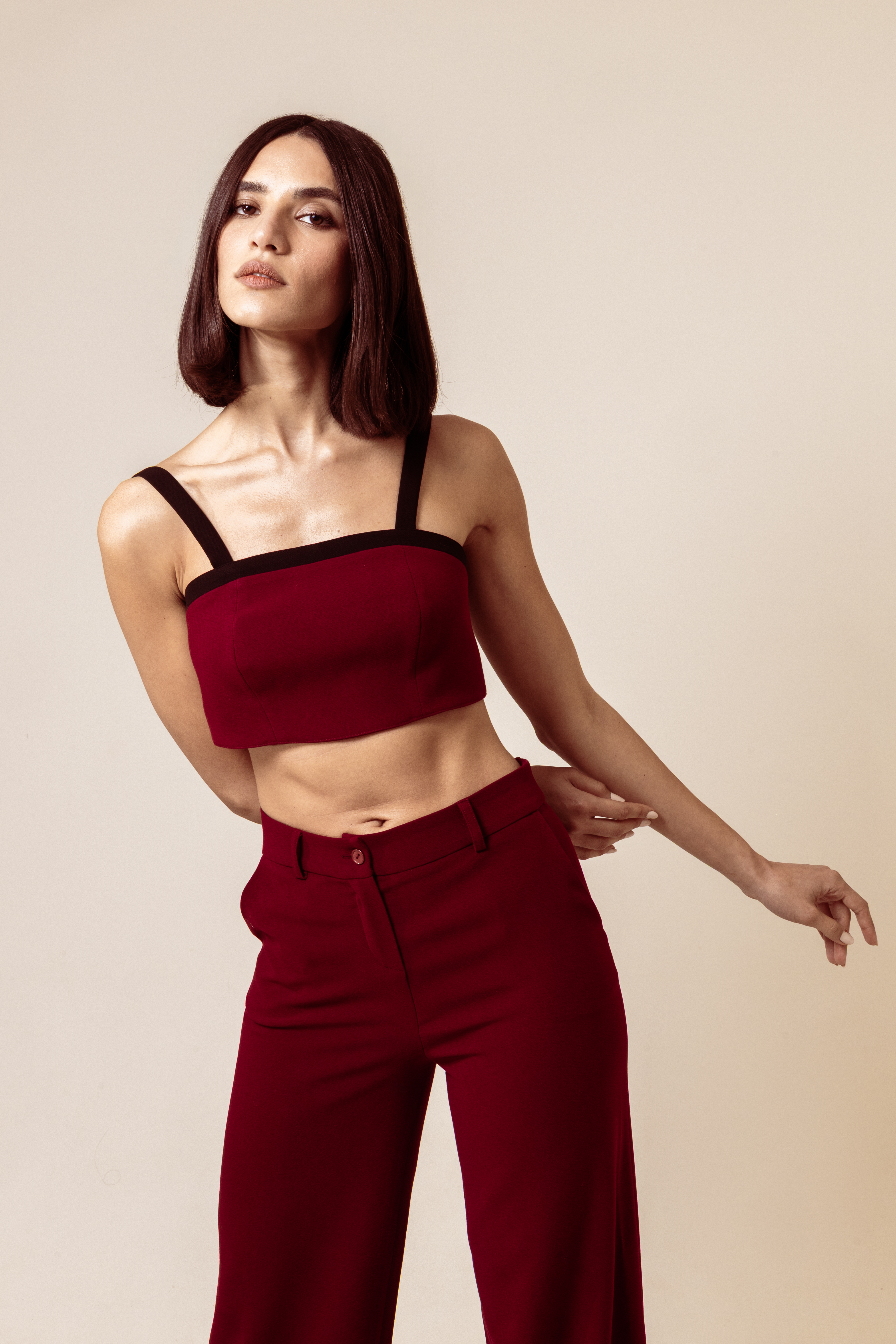 A chic three-piece set featuring a crop top, tailored blazer, and matching pants. Designed for a bold yet refined look, available in black and red.