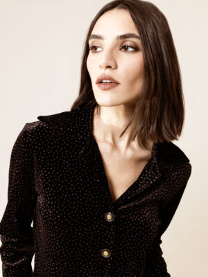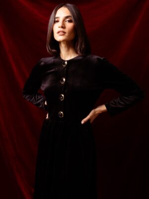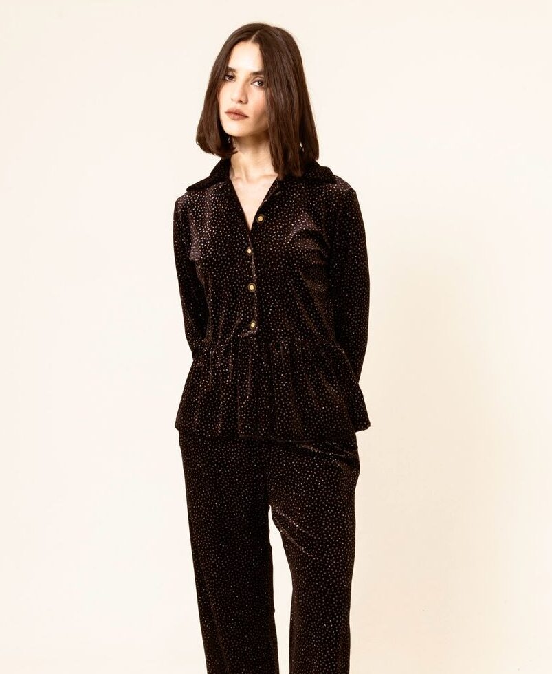 170 $Crafted in rich black velvet, this set includes a matching top and pants for an effortlessly polished silhouette. Soft, stylish, and versatile, it’s ideal for layering or wearing on its own for a standout look.
