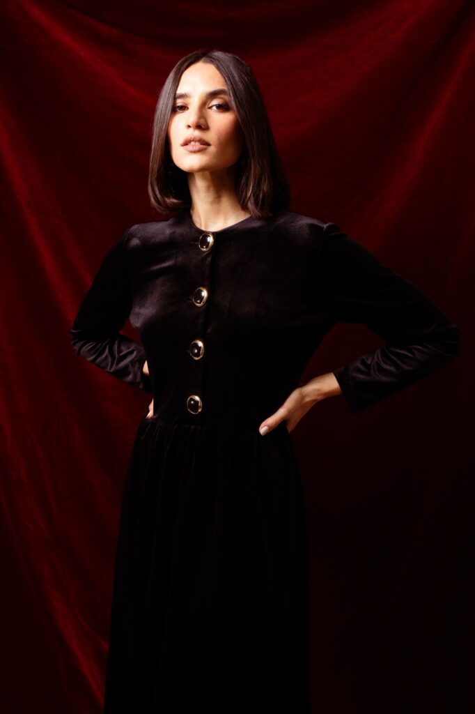 190 $A stunning velvet long dress with an open waist detail, designed to flatter your silhouette while adding a touch of drama. Perfect for evening events and special occasions.